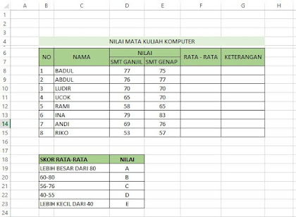 - kliklah sel F8 (untuk mengetahui nilai rata-rata)
